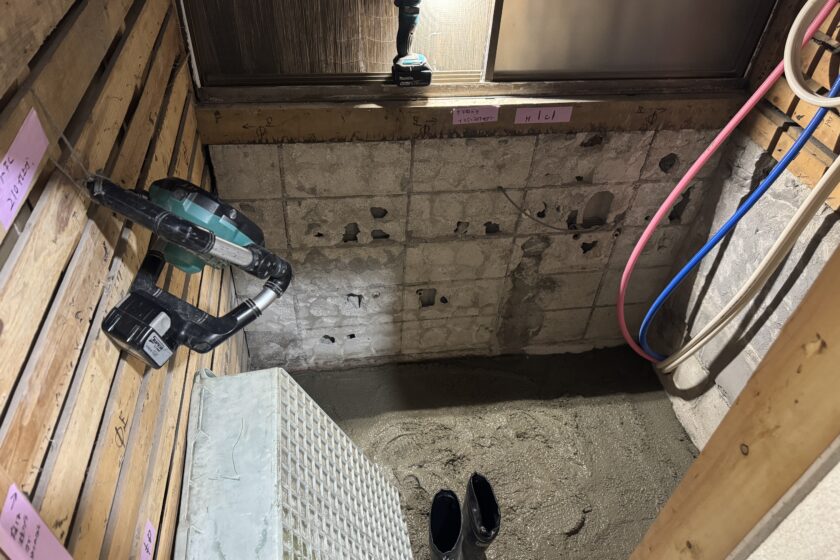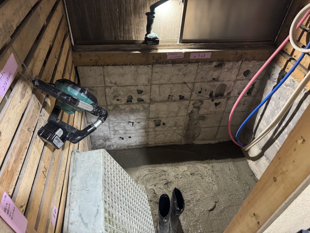 新しいユニットバスを設置するために、給排水管の仕込みや配管の位置確認を丁寧に行い、その後、しっかりとした土台をつくるための土間打ち工事を実施しました。見えなくなる部分だからこそ、精度と強度にこだわりながら一つひとつ確実に施工しています😊